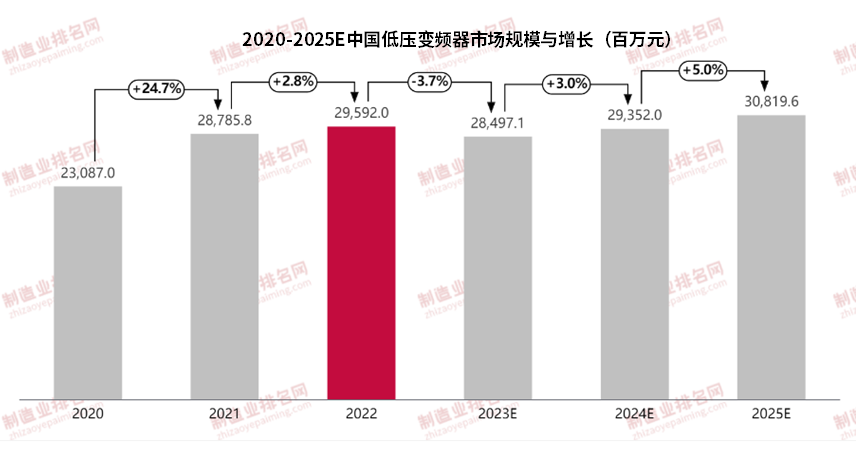 2022年低压变频器整体市场规模为295.9亿元,虽然存在疫情影响和房地产严重下滑等负面因素影响,但整体工业需求,尤其是项目市场仍有一定增幅,使得2022年低压变频器市场实现微增。